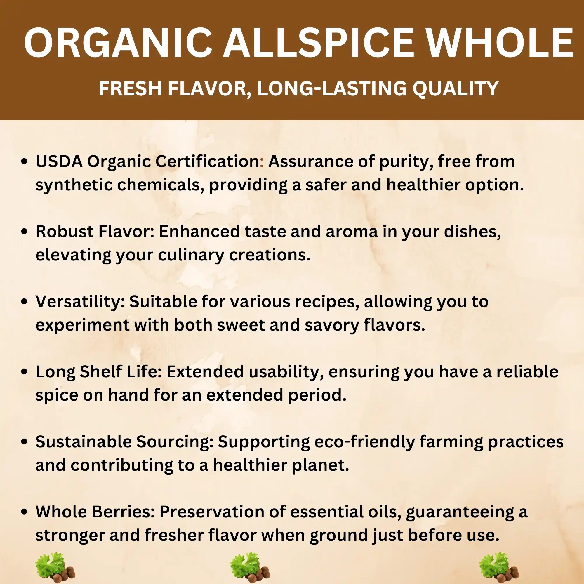 Crafted with pure ingredients, our all-natural and organic allspice ground powder offers a natural and savory addition to your recipes. Its rich, warm flavor is reminiscent of a blend of whole spices, making it a versatile seasoning for both sweet and savory dishes.