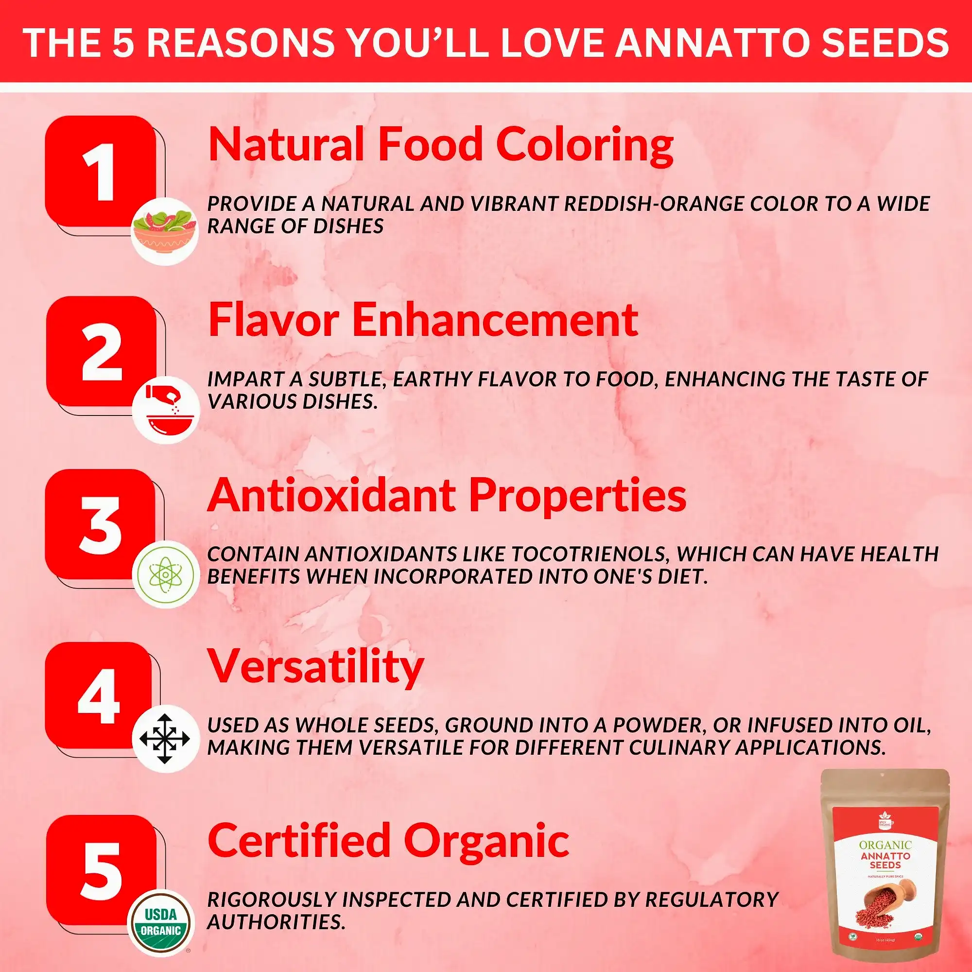 Organic Annatto Seeds- Certified USDA Organic- Achiote Seeds Spice Seasoning for Rice, Cheese, Sauces, Achiote Paste, Recado Rojo, Meats, Poultry and Fish