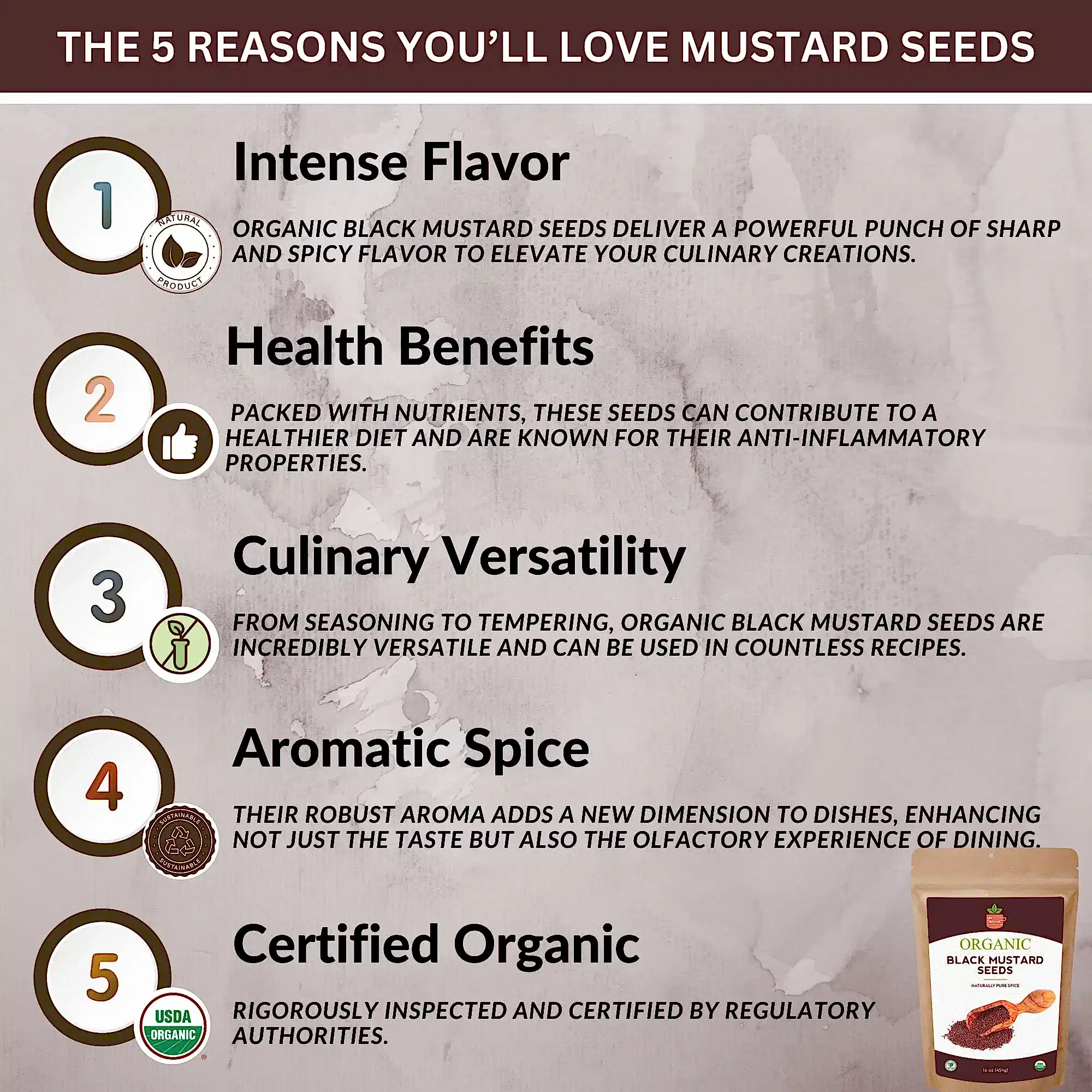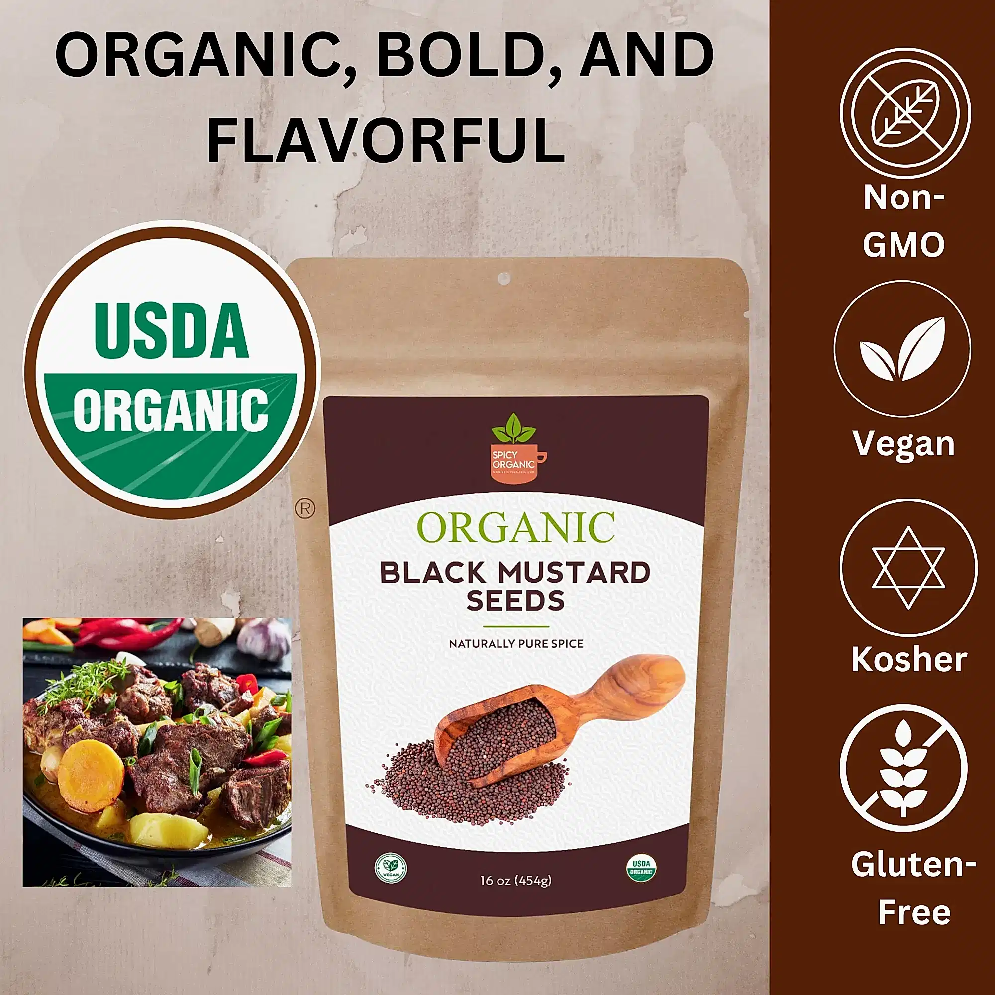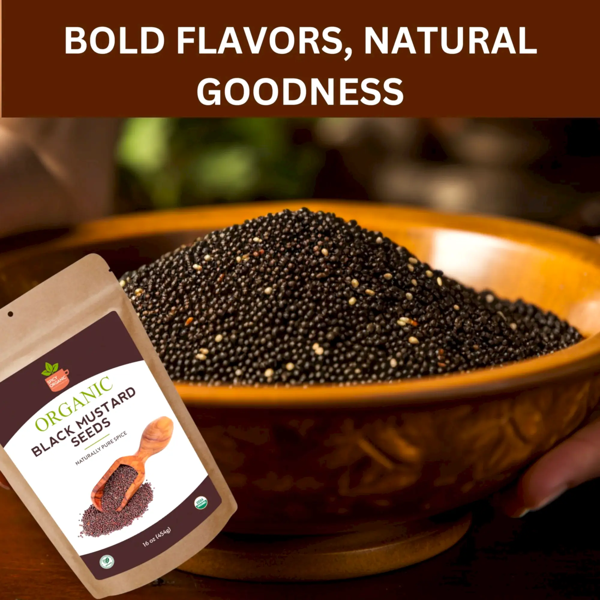 Our organic black mustard seeds are a versatile and high-quality choice for your kitchen. Certified USDA Organic, gluten-free, non-GMO, and kosher, these dry brown mustard seeds are perfect for both cooking and pickling.