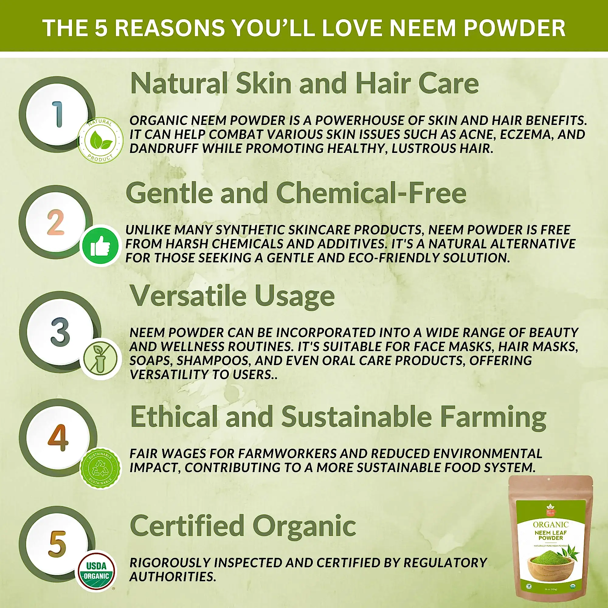 Organic Neem Powder – USDA Certified, 100% Pure Dried Neem Leaf – Non-GMO, Vegan, Gluten-Free – Fine Herbal Green Powder for Smoothies, Teas & DIY Skincare – Resealable Pouch