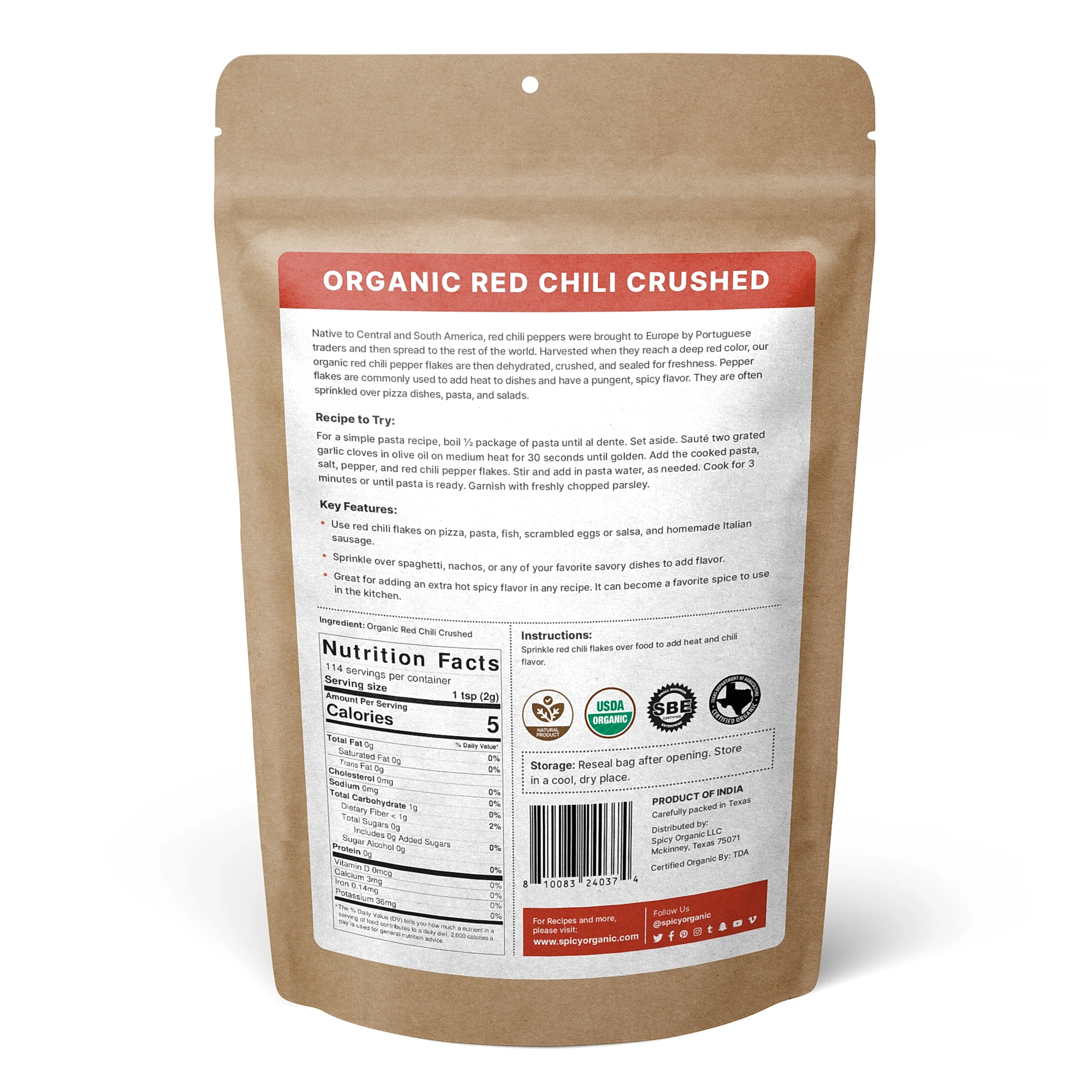 For an intense layer of spice, try adding red chili flakes to your next meal! Naturally made from jalapeno, serrano, and cayenne peppers, these spicy crushed red pepper flakes are a great way to incorporate controlled heat into almost any dish. These organic chili flakes are produced from organically grown peppers, so you can be sure your cooking is free of unhealthy substances.